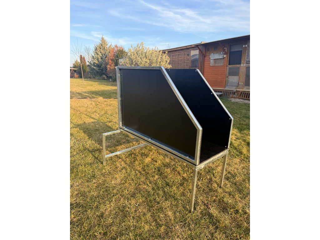 Box je vyrobený z pevného pozinkovaného oceľového rámu a odolnej vodovzdornej preglejky, ktorá znáša vysoké mechanické zaťaženie aj intenzívne používanie pri výcviku silných pracovných plemien. Stabilná kovová konštrukcia zabezpečuje dlhú životnosť a pevnosť aj pri dynamických zákusoch.